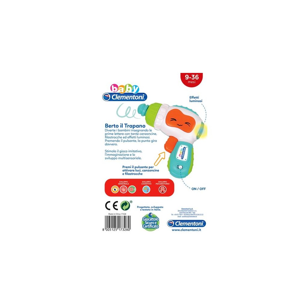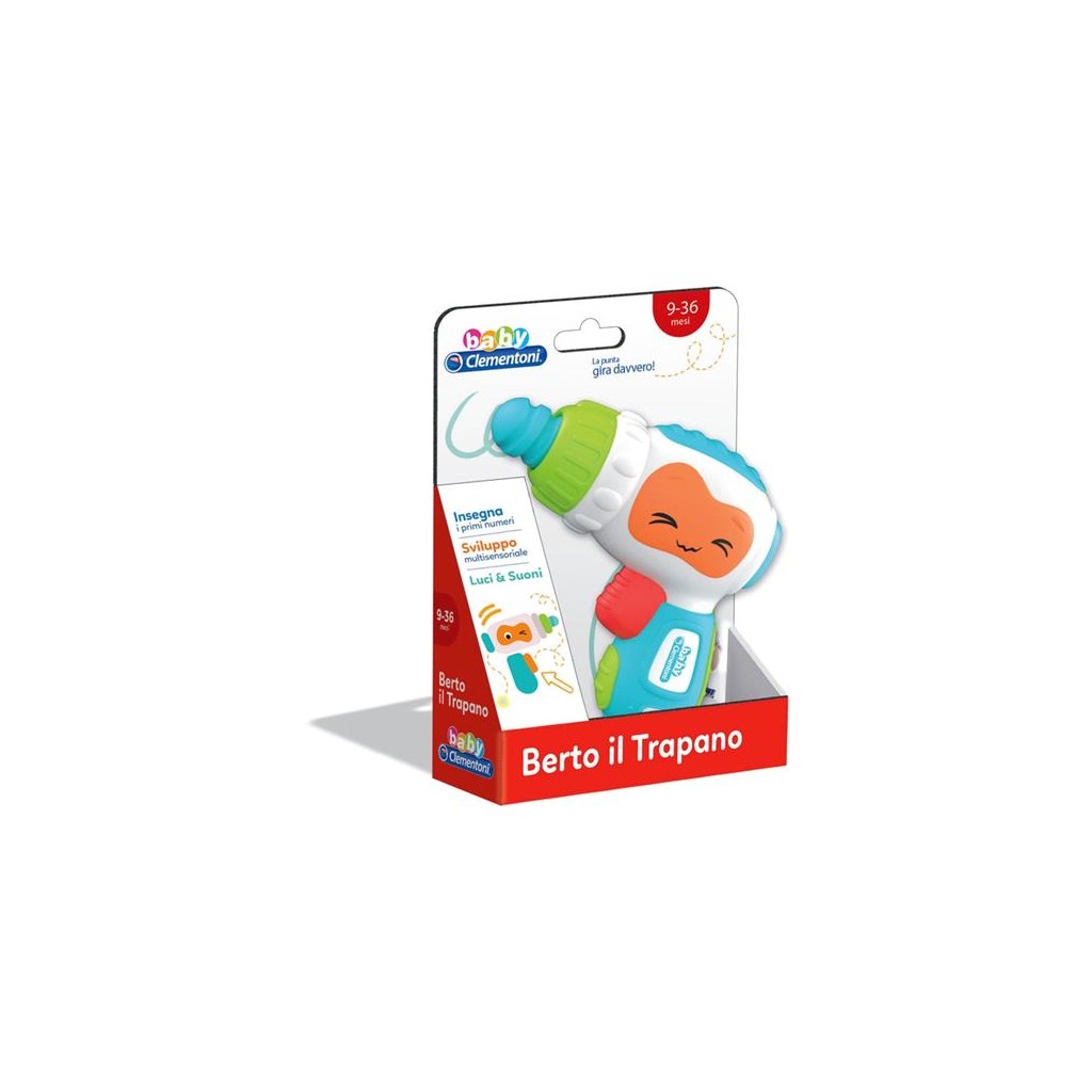 Un simpatico trapano per giocare e divertirsi, sviluppando la manualità e la comprensione della relazione causa-effetto. Premendo il pulsante la punta del trapano gira davvero e il retro si illumina. Favorisce lo sviluppo del bambino attraverso il gioco imitativo. Con tante simpatiche canzoncine e filastrocche